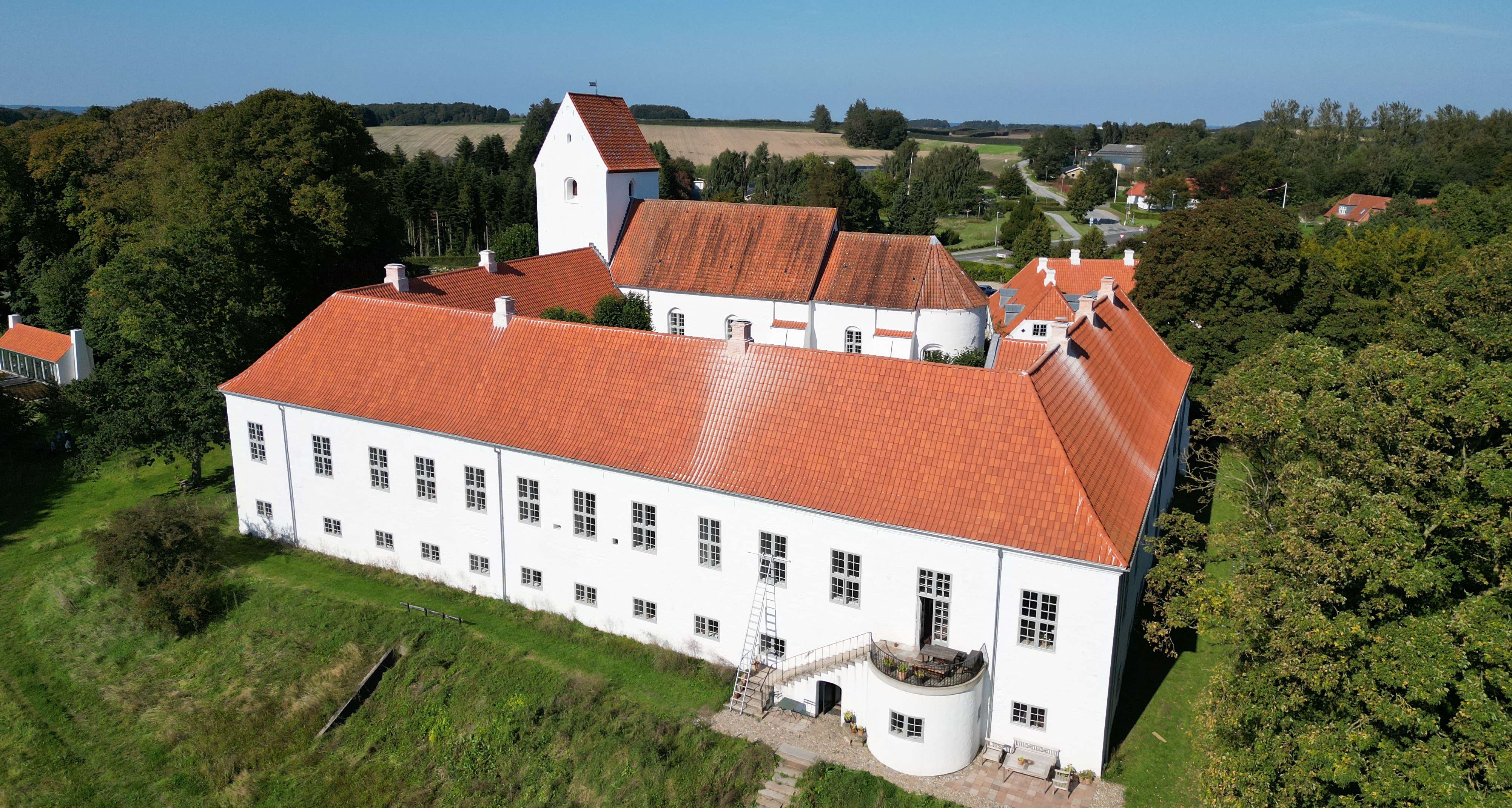 I den gamle klosterbygning har vi ti værelser, hvoraf fire er dobbeltværelser. I portnerboligen er der plads til op til 16 personer fordelt på 13 værelser.