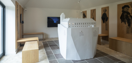 I fortællehuset kan man via en stor model af klostret se ind ad vinduerne til Ørslev Kloster og aktivere fortællinger og film om hele klosterets 800 års lange historie. Og via interviews med klostergæster får man desuden et rigtig godt indtryk af, hvad der foregår bag de tykke mure nu og her.